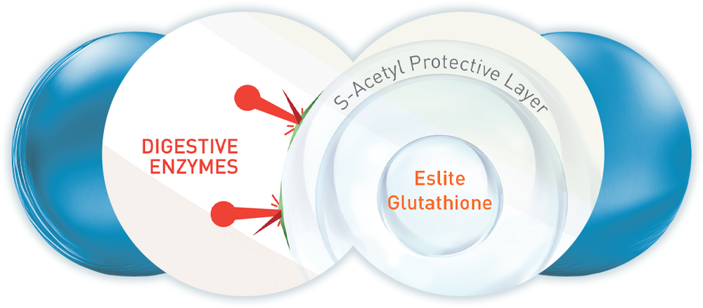Eslite's S-Acetyl acts as a protective layer so that 100% of the Glutathione in our capsules can safely pass through the digestive tract, and be fully absorbed by the body.